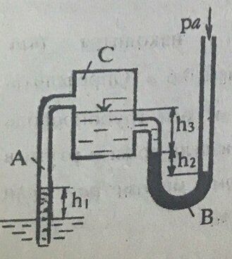 Для студентов по предмету Механика жидкости и газа (МЖГ или Гидравлика)Закрытый бак С частично заполнен водой. К баку присоединена трубка А, опущенная в водоем и ртутный U-образный вакуумметр В. На какую высоту h1 поднимаЗакрытый бак С частично заполнен водой. К баку присоединена трубка А, опущенная в водоем и ртутный U-образный вакуумметр В. На какую высоту h1 поднима