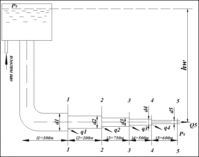высоту водонапорной башни и диаметр труб. Нарисовать схему трубопрово