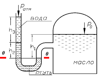 Главная » Учебные материалы » Механика жидкости и газа (МЖГ или Гидравлика) » Решения задач » Несколько классов/семестров » Чему равно манометрическое давление в сосуде по показанию дифманометра, если в левом его колене над ртутью налита вода, а в самом сосуде находится масло (рис. 2.47)? А h1 = 1,4м, h2 = 0,3м, h3 = 0,13м.