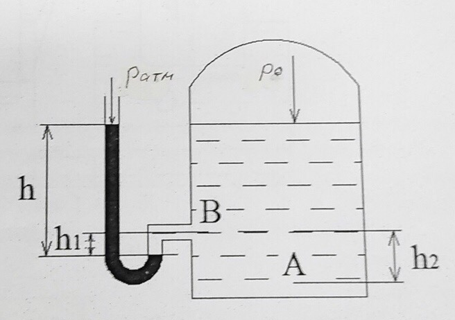 Определить избыточное и абсолютное давление в точке А закрытого резервуара с водой (рис. 4), если высота столба ртути в трубке дифманометра h=0,5м, а линия раздела между ртутью и водой расположена ниже точки В на величину h1=0,25м. Точка В выше точки А на величину h2=0,8м.