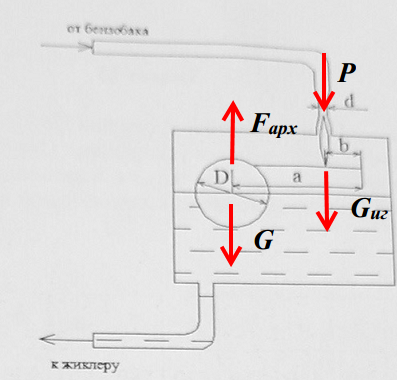 Определить диаметр цилиндрического поплавка помещенного в поплавко­вой камере карбюратора автомобильного двигателя (рис.8). Поплавок погружен в бензин на половину. Длина поплавка L=65мм. Размеры, соответствующие обо­значения на рисунке равны: а =60мм, b = 15 мм, d= 6 мм. Вес поплавка G =0,294Н, вес иглы Gиг = 0,0981Н.
