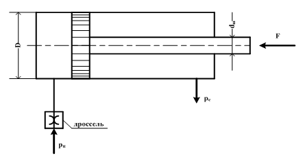 Поршень (см. рис.3), диаметром D движется в левую часть цилиндра со скоростью v=0,05м/с, под действием разности давлений в полостях, создаваемой подачей жидкости (ρ = 850 кг/м3) через дроссель (коэффициент расхода μ = 0,7, диаметр d) с избыточным да