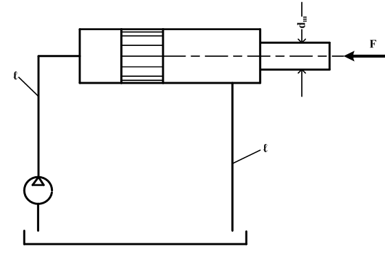 ​​​Насос подает жидкость с плотностью ρ = 830 кг/м3 и кинематической вязкостью 0,00005 м2/с в гидроцилиндр по трубопроводу длиной l, диаметром d, необходимо определить создаваемое насосом давление, если его производительность – Q. Потерями напора на местных сопротивлениях пренебречь. Диаметр поршня D = 0,1 м; диаметр штока dш = 0,05 м, сила, действующая на шток – F, Н. Исходные данные в табл. 5.