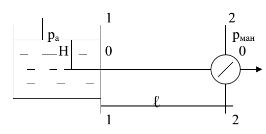 Определить необходимый диаметр напорного трубопровода ℓ=17м, для подачи воды ρ=1000 кг/м3 в количестве Q=2,7 л/с, если напор в сечении 1–1 составляет Н1=6,1м, а манометрическое давление в конце линии (сечение 2-2) составляет р=50кПа. Абсолютная