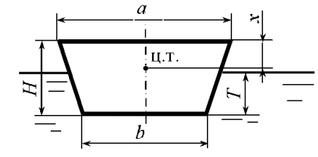 Определить, остойчив ли понтон длиной L = 6 м, плавающий в воде в положении, указанном на схеме (рис. 1), если а=2м, b=1м, Н = 1,6 м, Т = 0,5 и x=0,5 м.