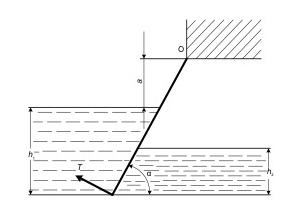 Определить силу давления воды на прямоугольный наклонный щит (рис. 1) и центр давления. Глубина перед щитом h1=1,8м. за щитом h2=0,6м. ширина щита b=1.6м. Угол наклона щита к горизонту а=300. Расчет выполнить аналитически и графоаналитическим способами. Найти начальное подъёмное усилие исходя из условия, что щит при подъеме вращается вокруг шарнира О, а сила тяги Т действует по перпендикуляру к плоскости щита. Превышение шарнира над горизонтом воды перед щитом а=0,4м. Весом щита и трением в шарнире пренебречь. Удельный вес жидкости γ=9810 Н/м3.