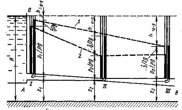 3) в выбранном масштабе построить сечение трубопровода относительно горизонтальной плоскости, напорную линию, пьезометрическую и линию полного гидродинамического напора;