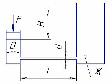 Поршень диаметром D движется равномерно вниз в цилиндре, подавая жидкость Ж в открытый резервуар с постоянным уровнем. Диаметр трубопровода d, его длина l. Когда поршень находится ниже уровня жидкости в резервуаре на H=5 м, потребная для его перемещения сила равна F. Определить скорость поршня и расход жидкости в трубопроводе. Построить напорную и пьезометрическую линии для трубопровода. Коэффициент гидравлического трения трубы принять λ=0,3. Коэффициент сопротивления входа в трубу ξвх=0,5, Коэффициент сопротивления выхода в резервуар ξвых=1,0.