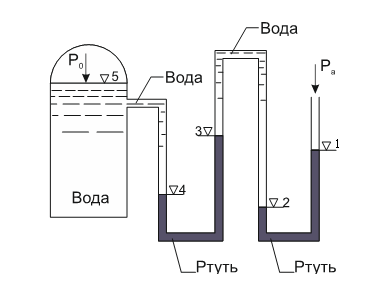Главная » Учебные материалы » Механика жидкости и газа (МЖГ или Гидравлика) » Решения задач » Несколько классов/семестров » Определить абсолютное давление пара на поверхности воды в котле по показаниям батарейного ртутного манометра, если даны отметки уровней в метрах от условного нуля. ▼1, м▼2, м▼3, м▼4, м▼5, мPa, мм.рт.ст 6,04,96,25,16,7754