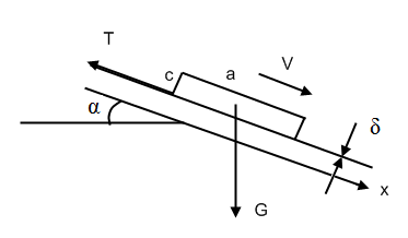 Определить скорость V равномерного скольжения прямоугольной пластины (a×b×c) по наклонной плоскости под углом α = 12°, если между пластиной и плоскостью находится слой масла толщиной δ. Температура масла 30 °С, плотность материала пластины ρ.