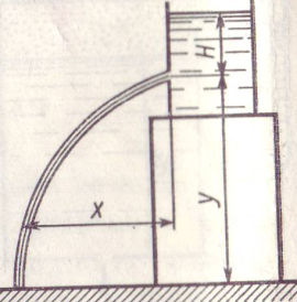 При истечении жидкости через отверстие диаметром do = 10 мм измерены: расстояние х = 5,5 м (см. рис.), высота y = 4 м, напор H = 2 м и расход жидкости Q = 0,305 л/с. Подсчитать коэффициенты сжатия e, скорости j, расхода m и сопротивления z. Распреде