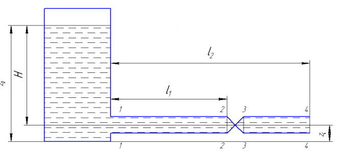 Главная » Учебные материалы » Механика жидкости и газа (МЖГ или Гидравлика) » Решения задач » Несколько классов/семестров » Из бака при постоянном напоре Н по прямому горизонтальному трубопроводу длиной l и диаметром D вытекает вода в атмосферу. На расстоянии l1 от бака установлен вентиль (дроссель). Определить расход воды в трубопроводе, при открытом вентиле и построить