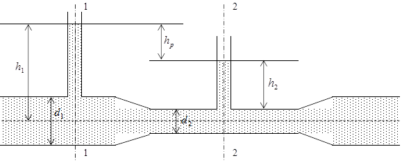 По трубопроводу переменного сечения протекает вода с расходом Q=14,3 л/с, диаметр суженной части d2=85 мм. Определить диаметр основного трубопровода d1, если разность показаний пьезометров hp=0,25 м.