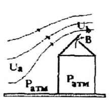 Воздух плотности р, имея ско­рость на подходе к зданию, равную UА, над коньком здания имеет ско­рость, равную Uв, причем UAB (рис.1). Давление на подходе к зданию и в самом здании равно ат­мосферному, благодаря этому в фонаре здания В создается тяга