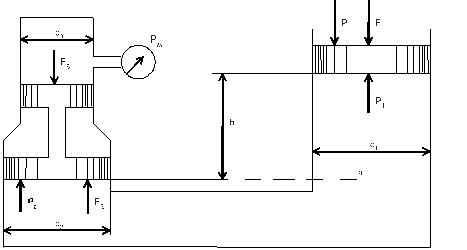 Определить манометрическое давление Рм (МПа) в верхней части одного из сообщающихся сосудов, наполненных водой, под действием силы Р, приложенной к поршню правого сосуда. Исходные данные: Сила давления Р = 250 (кH) = 250000 (Н) Диаметр первого со