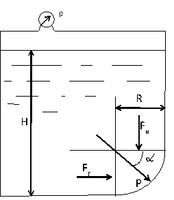Определить величину Р (кН) и направление α,º равнодействующей давления воды на криволинейную стенку резервуара в виде четверти цилиндрической поверхности.