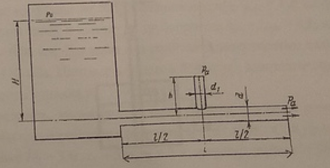 Определить, каким должно быть давление po над свободной поверхностью воды в баке (рис. 6), чтобы вода вытекала с расходом Q=100 л/ч, если уровень воды в баке Н=2 м, диаметр сечения трубы d=22 мм; длина трубы L=8,8 м; коэффициент входного сопротивлени
