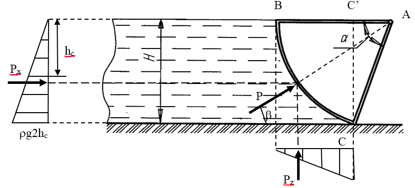 Определить величину и направление силы суммарного давления на секторный затвор, и ее направление (рис. 1). Глубина воды перед затвором Н, ширина затвора b. Дано: H = 0,4 м; b = 0,7 м; α = 60º.