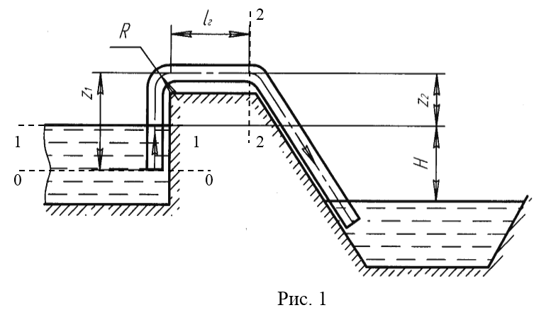 Сифонный бетонный водосброс внешним диаметром d общей длиной l сбрасывает воду из водохранилища в реку, уровень которой на Н ниже уровня водохранилища (рис. 1). Определить подачу сифонного водосброса, если он имеет два поворота: α1 = 90º, α2 с радиусами закругления R. Длина горизонтального участка lг, толщина стенок водосброса δ. Температура воды в водохранилище t. Определить также вакуум в верхней точке сифона.