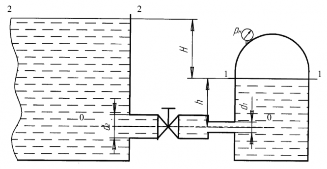 По короткому трубопроводу, участки которого имеют диаметры d1 и d2, вода перетекает из закрытого бака с избыточным давлением воздуха рм в открытый бак при постоянной разности уровней Н (рис. 1). Ось трубопровода заглублена под уровень в правом баке н