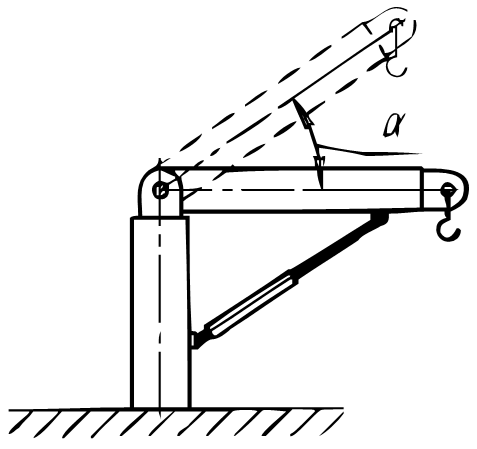 Известны следующие величины простейшего гидравлического подъёмного устройства (см. Рис.): масса груза m, длина стрелы l, максимальный угол α, давление нагнетания насоса P=16 МПа, подача насоса Q=12 л/с.