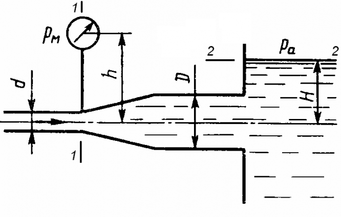 Определить расход жидкости, вытекающей из трубы диаметром d=16 мм через плавное расширение (диффузор) и далее по трубе диаметром D=20 мм в бак. Коэффициент сопротивления диффузора =0,2 (отнесен к скорости в трубе), показание манометра =20 кПа; высота h=0,5 м; H=5 м; плотность жидкости =1000 кг/м3. Учесть потери на внезапное расширение, потерями на трение пренебречь, режим течения считать турбулентным.