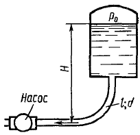 На рисунке показан всасывающий трубо­провод гидросистемы. Длина трубопровода l= 1 м, диаметр d = 20 мм, расход жидкости Q = 0,314 л/с, абсолютное давление возду­ха в бачке р0 = 100 кПа, Н = 1 м, плотность жидкости r = 900 кг/м3. Опре­делить абсолютное давление перед входом в насос при температуре рабочей жидкости t= +25°С (n = 0,2 Ст). Как изменится искомое давление в зимнее время, когда при этом же расходе температура жидкости упадет до -35 °С (n=10 Ст).