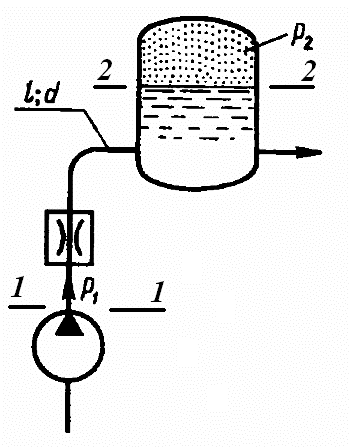 Главная » Учебные материалы » Механика жидкости и газа (МЖГ или Гидравлика) » Решения задач » Несколько классов/семестров » Номер 4 » Вариант 17 » Какое давление должен создавать насос при подаче масла Q=0,4 л/с и при давлении воздуха в пневмогидравлическом аккумуляторе р2=2 МПа, если коэффициент сопротивления квадратичного дросселя ξ=100; длина трубопровода от насоса до аккумулятора l=4 м; диа