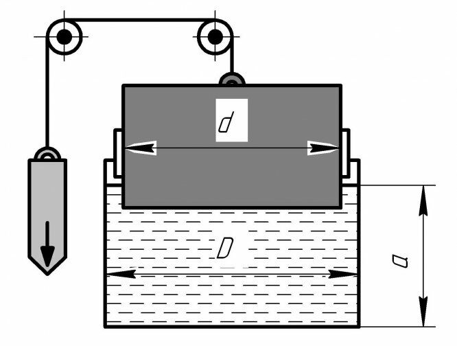 Для студентов УрГАУ по предмету Механика жидкости и газа (МЖГ или Гидравлика)Цилиндрический резервуар диаметром ‘D’, весом ‘G’, заполненный водой на высоту а, висит на поршне диаметром ‘d’. К поршню через блоки подвешен груз, уЦилиндрический резервуар диаметром ‘D’, весом ‘G’, заполненный водой на высоту а, висит на поршне диаметром ‘d’. К поршню через блоки подвешен груз, у