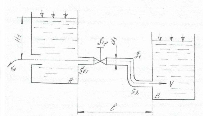 Для студентов УрГАУ по предмету Механика жидкости и газа (МЖГ или Гидравлика)Вода при температуре t из резервуара А подается в резервуар В со скоростью υ по стальному трубопроводу диаметром d1 и длиной l1. Уровень воды в баке АВода при температуре t из резервуара А подается в резервуар В со скоростью υ по стальному трубопроводу диаметром d1 и длиной l1. Уровень воды в баке А