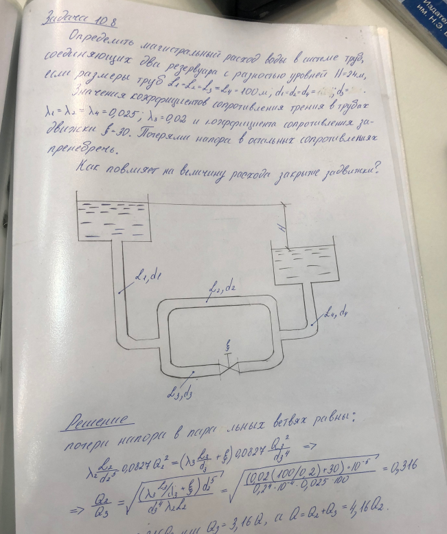 Задача (Куколевский И.И.) 10-8. Определить расход воды в системе труб, соединяющих два резервуара с разностью уровней Н=24 м, если размеры труб L1=L2=L3=L4=100 м, d1=d2=d4=100м, d3=200м Значения коэффициента сопротивления трения в трубах л1=л2=л4=0,025, л3=0,02 и коэффициента сопротивления задвижки С = =30. Как повлияет на величину расхода закрытие задвижки?Ответ. Q= 23,7 л/сек. Q = 19,6 л/ сек.