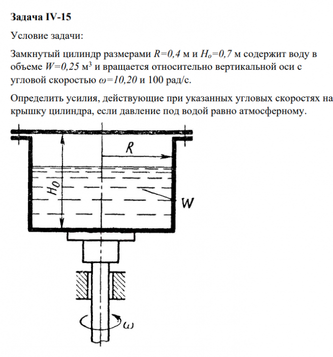 Задача (Куколевский И.И.) 4-15. Замкнутый цилиндр размерами R= 0,4 лг и H0 = 0,7 м содержит воду в количестве W = 0,25 м3 и вращается относительно вертикальной оси с угловой скоростью w = 10; 20 и 100 рад/с. Определить усилия, действующие при указанных оборотах на крышку цилиндра, если давление над водой равно атмосферному.. Ответ. Р = 0,176 кН; 2,9 кН и 100 кН