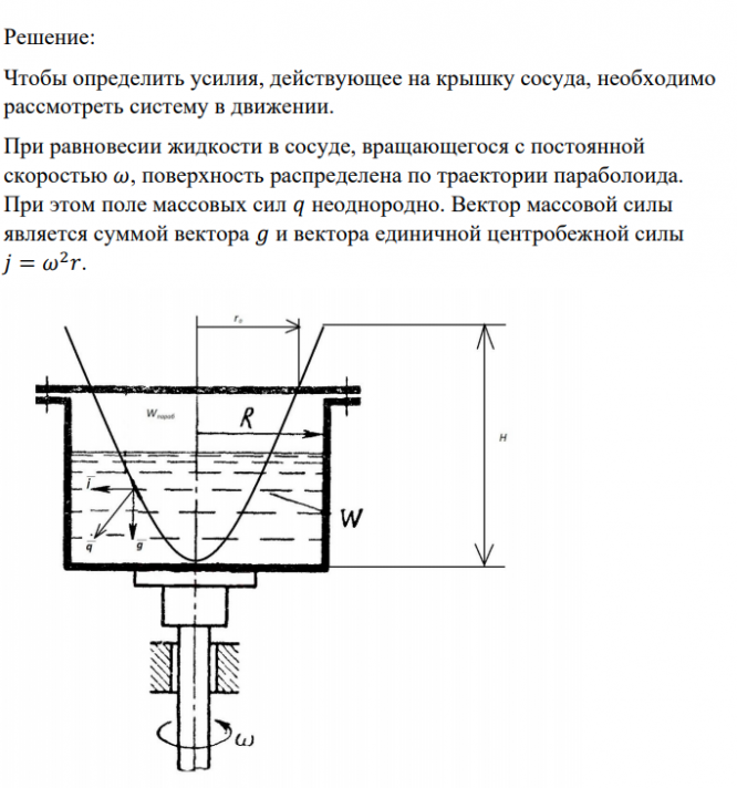 Задача (Куколевский И.И.) 4-15. Замкнутый цилиндр размерами R= 0,4 лг и H0 = 0,7 м содержит воду в количестве W = 0,25 м 3 и вращается относительно вертикальной оси с угловой скоростью w = 10; 20 и 100 рад/с. Определить усилия, действующие при указанных оборотах на крышку цилиндра, если давление над водой равно атмосферному. . Ответ. Р = 0,176 кН; 2,9 кН и 100 кН.