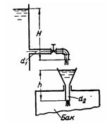 Задача (Куколевский И.И.) 7-4 . Заполнение бака бензином происходит через воронку диаметром d 2  = 50 мм, высотой h = 400 мм с коэффициентом сопротивления ? = 0,25. В воронку бензин заливается из резервуара с постоянным уровнем по короткой трубе диаметром d 1  = 30 мм с краном и угольником, коэффициенты сопротивления которых соответственно ? = 8,5 и 0,8. Определить, какой наибольший напор Н можно иметь в резервуаре, чтобы воронка не переполнялась, и каков при этом расход бензина, поступающего в бак. Потери на трение в трубе не учитывать. Отвгт. H= 26,6 м, Q=4,9 л/сек.