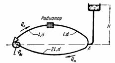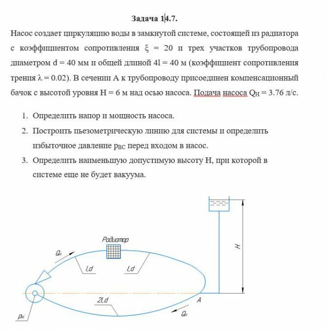 Задача (Куколевский И.И.) 14-7. Насос создает циркуляцию воды в замкнутой системе, состоящей из радиатора с коэффициентом сопротивления СR = 20 и трех участков трубопровода диаметрами d = 40 мм и общей длиной 4*l= 40 м (коэффициент сопротивления трения 0,02). В точке А к трубопроводу присоединен компенсационный бачок с высотой уровня H = 6 м над осью насоса. Подача насоса QН = 3,76 л/сек. 1. Определить напор и мощность насоса. 2. Построить пьезометрическую линию для системы и определить давление перед входом в насос. 3. Определить минимально допустимую высоту Н, при которой в системе не будет вакуума.