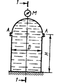 Вертикальная цилиндрическая цистерна с полусферической крышкой до самого верха заполнена жидкостью, плотность которой r. Диаметр цистерны D, высота ее цилиндрической части Н. Манометр М показывает манометрическое давление рм. Определить силу, растягивающую болты А, и горизонтальную силу, разрывающую цистерну по сечению 11. Силой тяжести крышки пренебречь. Векторы сил показать на схеме.