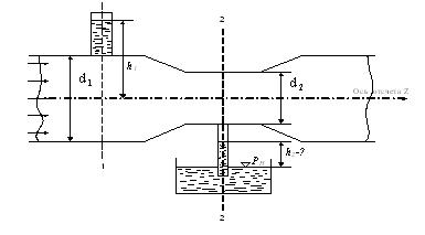 К расходометру Вентури присоединены два пьезометра (см. рис.). Первый и второй пьезометры показали 50 см и 30см столба воды соответственно. Найти скорость в широкой части, которое находится до сужения трубки – W1 и массовый расход воды - m, если известны диаметры поперечного сечения широкой и узкой части - d1=250 мм, d2=125 мм. Жидкость считать несжимаемой. Гидравлические потери в трубки Вентури не учитывать (они не велики).