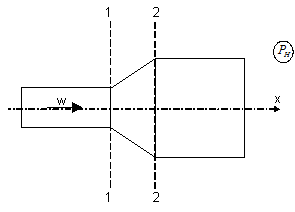 Главная » Учебные материалы » Механика жидкости и газа (МЖГ или Гидравлика) » Решения задач » Определить избыточное давление на входе в диффузор, так чтобы величина силы, действующей вдоль оси канала была равна нулю при истечении из него воды с объемным расходом - 0,01м3/с. Диаметр на входе - 30 мм, а диаметр выходного отверстия - 100 мм. Сил