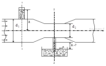 Главная » Учебные материалы » Механика жидкости и газа (МЖГ или Гидравлика) » Решения задач » Несколько классов/семестров » Воздух продувается через трубу с расходом Q=25∙10-3 м3/с. Диаметры поперечного сечения в широкой и узкой части соответственно равны d1=100 мм, d2=50 мм. Найти высоту уровня жидкости h2, если известно, что манометр, установленный в широкой части трубы