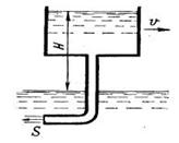 Определить реакцию и полезную механическую мощность, развиваемую потоком воды на подвижном сосуде, который перемещается со скоростью v и из которого жидкость вытекает через трубу с выходным сечением S=25 см2 под постоянным напором H. Гидравлическими