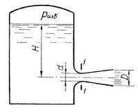 Пренебрегая потерями, определить давление в узком сечении 1-1 диффузора при истечении бензина (ρв = 750 кг/м3) из бака через диффузор в атмосферу, если уровень бензина в баке H и избыточное давление pизб =24 кПа постоянны, а d:D=0,90.