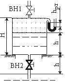 Цилиндрический резервуар высотой H установлен на высоте h над уровнем воды в открытом водоеме. При открытом вентиле ВН1и закрытом вентиле ВН2 резервуар заполнен водой при атмосферном давлении до уровня h. После закрытия вентиля ВН1 и открытия вентиля