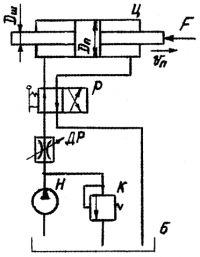 Гидропривод поступательного движения приводится от насоса, характеристика которого определена точками (0л/с, 5,5МПа), (0,5л/с, 5,0МПа), (0,6л/с, 0,0МПа). Шток гидроцилиндра нагружен силой F, поршень имеет диаметр Dп, шток Dш=0,5Dп, механический КПД г