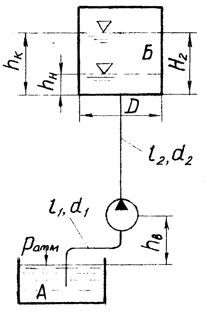 Центробежный насос перекачивает легкую нефть из открытого резервуара А в закрытый бак Б цилиндрической формы, высота бака H2 . Температура перекачиваемой жидкости Т. Стальные трубы всасывания и нагнетания соответственно имеют диаметр d1 и d2 , длину l1 и l2 . В каких пределах изменяются напор и подача насоса в начале и в конце наполнения бака жидкостью от hн=0,1H2 до hк=0,7H2 , полагая, что в начале наполнения давление воздуха в баке равнялось атмосферному, а сжатие воздуха происходит по изотермическому закону. Считать, что высота всасывания hв=1,6 м в процессе работы насоса остается постоянной. Принять, что движение жидкости в начальный и конечный моменты наполнения бака является установившимся. Местными гидравлическими сопротивлениями можно пренебречь.