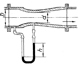 Расход жидкости в трубопроводе измеряется с помощью расходомера Вентури. Показание присоединенного к нему ртутного (ρрт=13,6·103 кг/м3) дифференциального манометра h. Размеры расходомера D и d. Определить расход воды, считая ее невязкой.