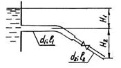 Вода вытекает в атмосферу из резервуара с постоянным уровнем по трубопроводу ( d1 ,l1 и d2 ,l2 ). Горизонтальный участок заглублен под уровень на H1 , наклонный участок имеет высоту H2 =18,0 м. Шероховатость стенок трубопровода Δ=0,50 мм, коэффициент