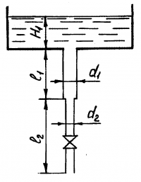 Из открытого резервуара через вертикальную трубу (d1, l1 и d2, l2) в атмосферу вытекает вода. Уровень в резервуаре постоянный, глубина H1. Шероховатость стенок труб Δ=0,35 мм. Коэффициент сопротивления крана ζк. Определить расход воды.