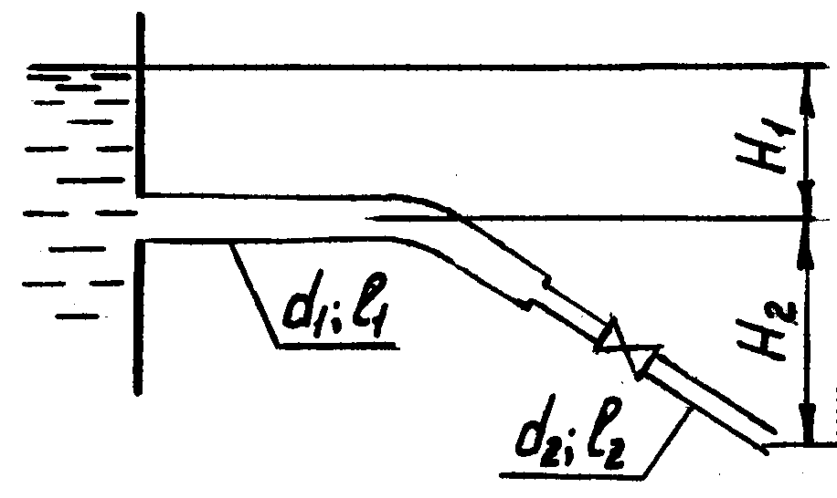 Вода вытекает в атмосферу из резервуара с постоянным уровнем по трубопроводу (d1, l1 и d2, l2). Горизонтальный участок заглублен под уровень на H1, наклонный участок имеет высоту H2=15,0 м. Шероховатость стенок трубопровода Δ=0,20 мм, потерю напора н