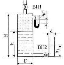 Закрытый сосуд высотой H и диаметром D соединен трубой с открытым сосудом диаметром d. При открытом вентиле BH1 и закрытом вентиле BH2 левый сосуд заполнен водой при атмосферном давлении до уровня h. После закрытия вентиля BH1 и открытия вентиля BH2