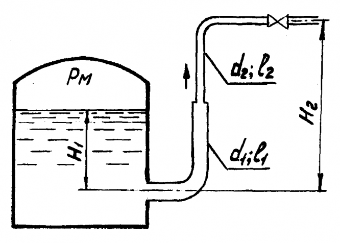 Главная » Учебные материалы » Механика жидкости и газа (МЖГ или Гидравлика) » Решения задач » НГТУ им. Р.Е. Алексеева » Несколько классов/семестров » Номер 6 » Вариант 3 » Из резервуара по трубопроводу (d1, l1, d2, l2) подается вода на высоту H2=10м. Шероховатость стенок трубопровода ∆=0,20мм. Коэффициент сопротивления для крана принять равным zК, а для поворотов трубопровода - zпов= 0,40. Определить расход воды через